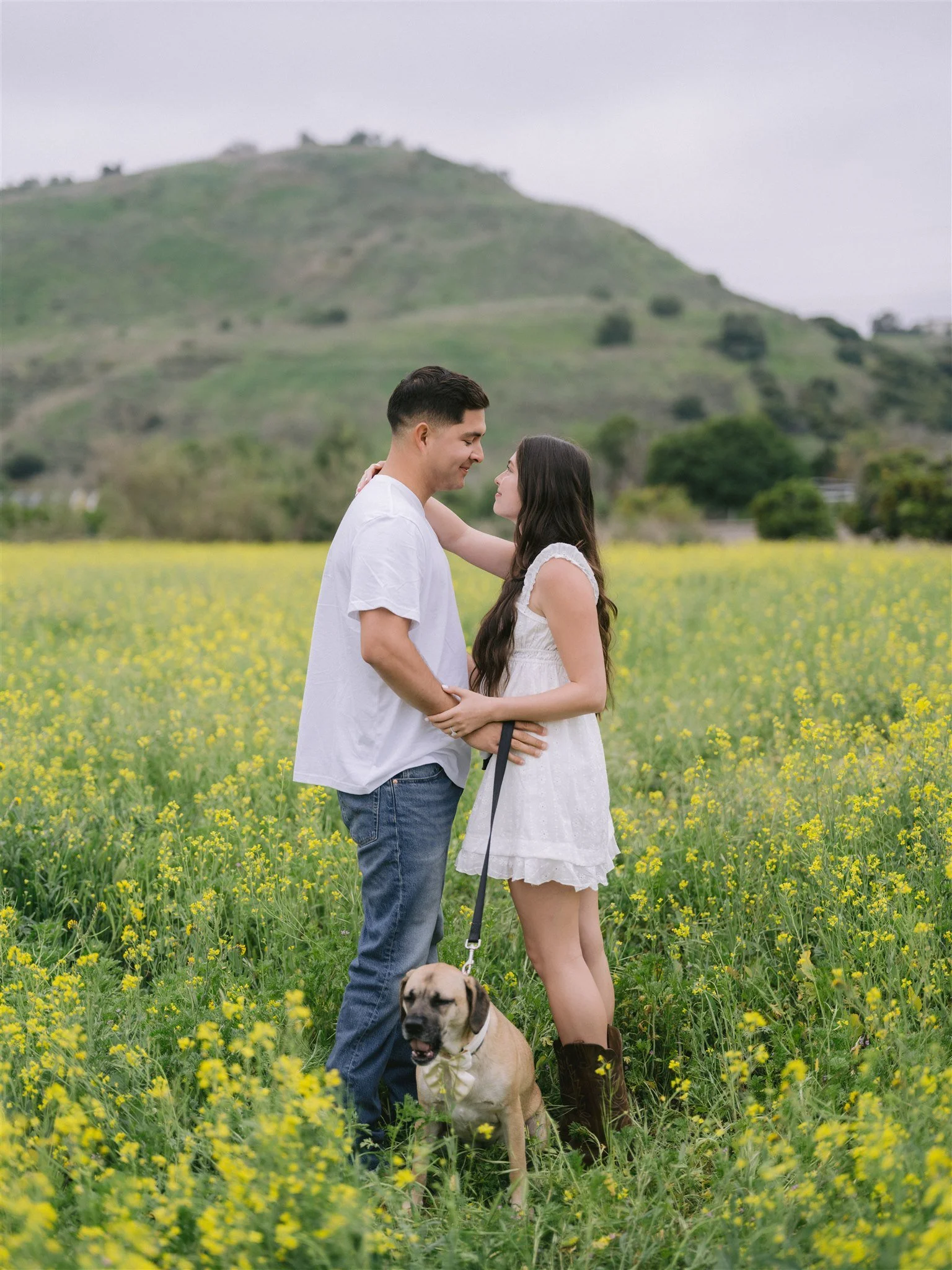 Soft light, open fields, and wild flowers surrounding them at every step.