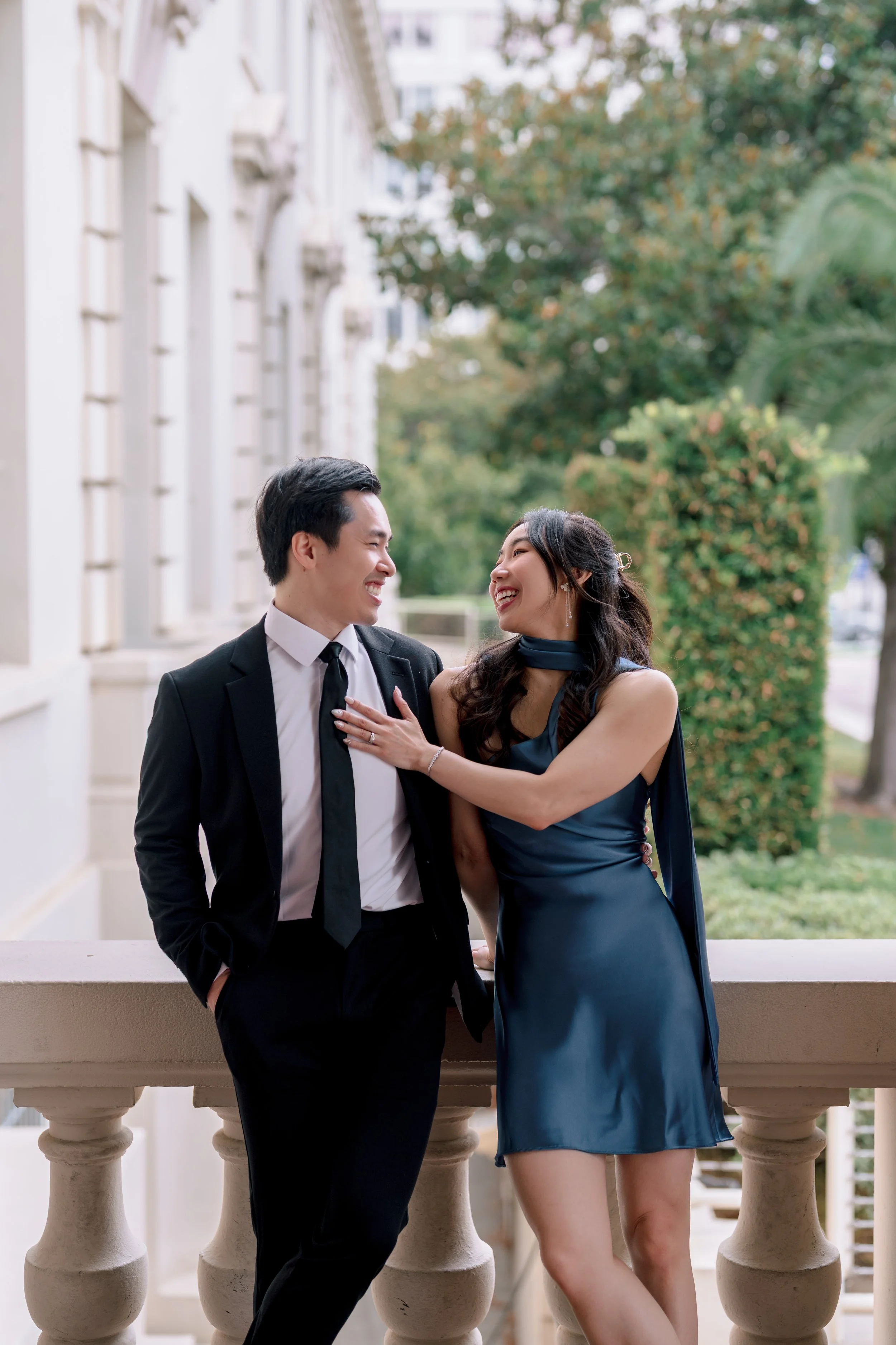 A man and woman dressed in formal attire laughing and smiling on a balcony with a European-style building and greenery in the background.