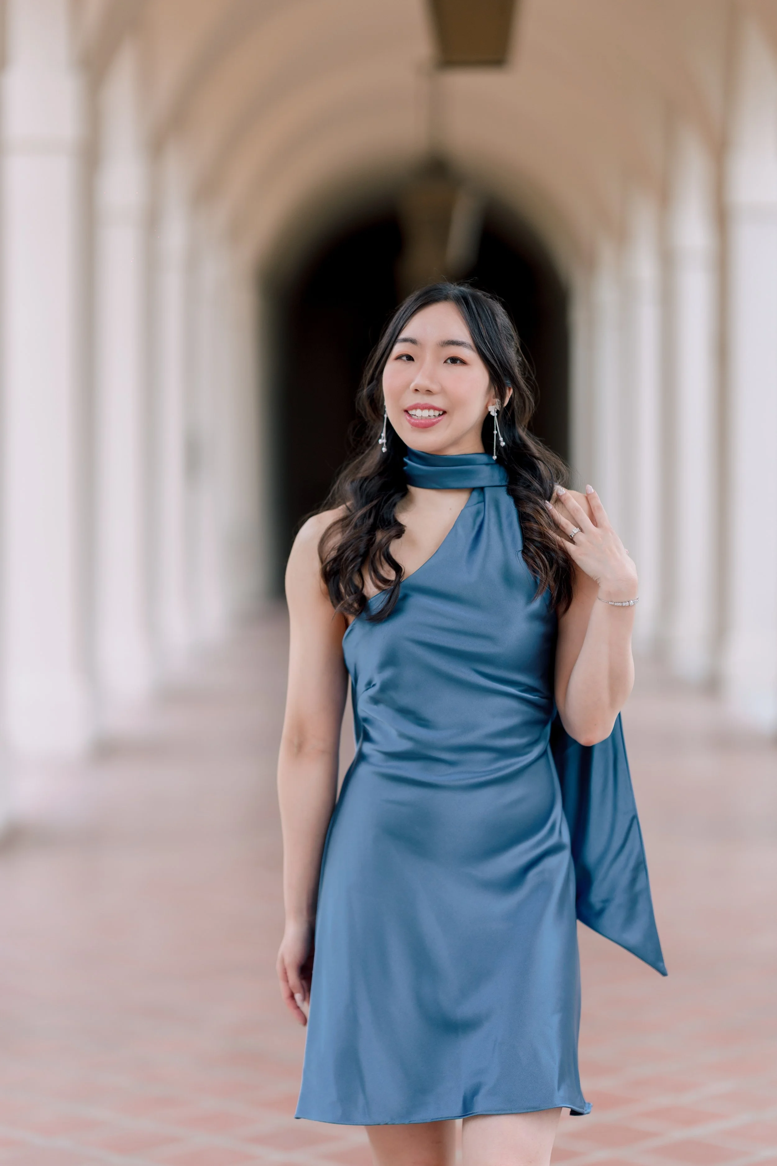 A woman in a blue satin dress with a matching scarf around her neck, standing in a covered walkway with archways, smiling and looking at the camera.