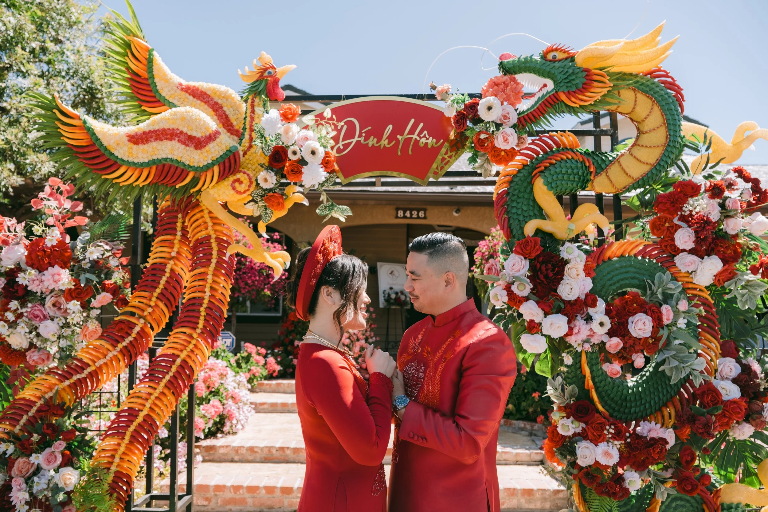 A couple in traditional Vietnamese red áo dài clothing standing in front of a decorative gate with colorful dragon and phoenix sculptures, surrounded by flowers, at a festive celebration.